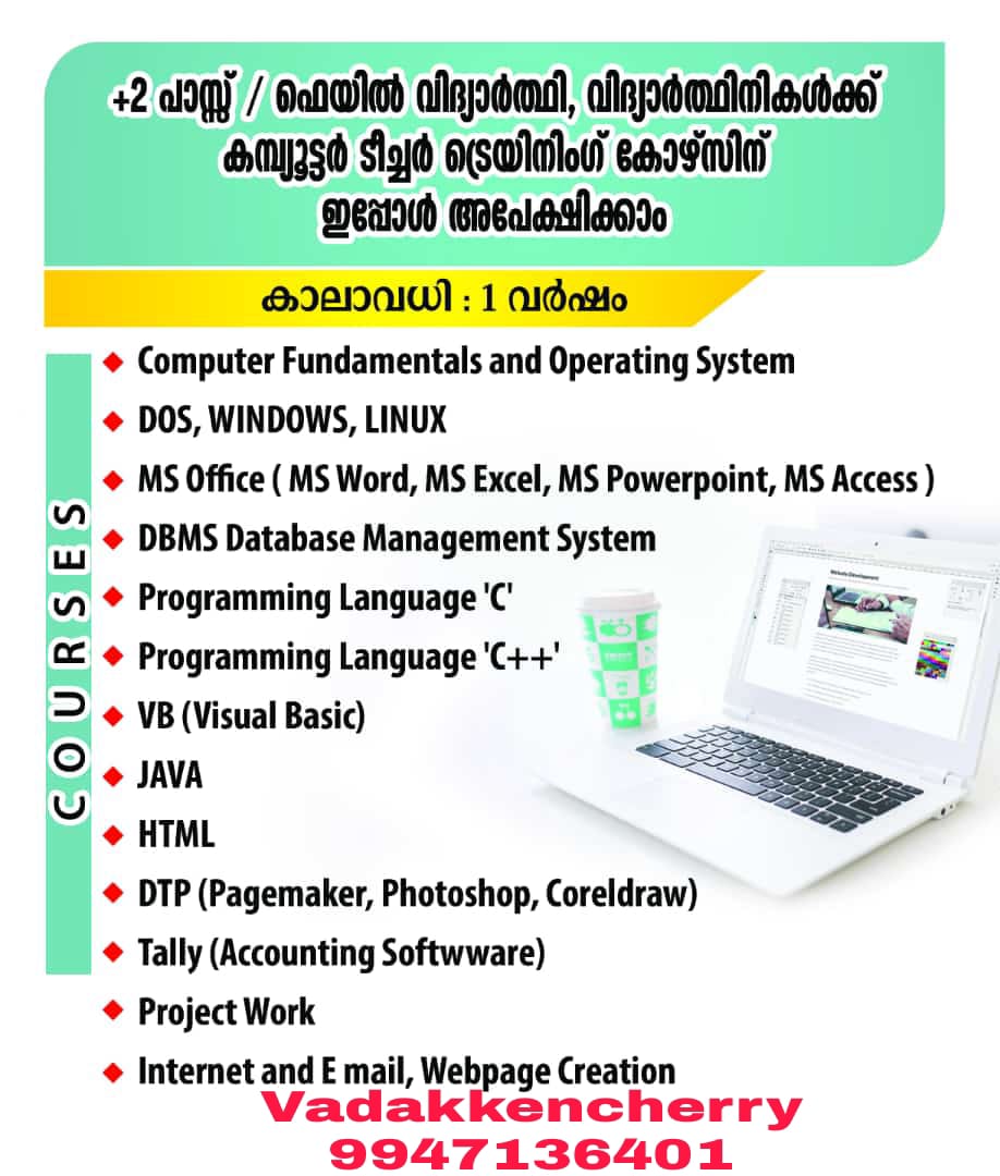 പഠനം പൂർത്തിയായ ഉടൻ ജോലി ആഗ്രഹിക്കുന്നവരാണോ നിങ്ങൾ …….എങ്കിൽ കേരള സർക്കാർ വിദ്യാഭ്യാസ വകുപ്പിന്റെ കീഴിലുള്ള C apt multimedia academy നടത്തുന്ന ഗവൺമെന്റ് അംഗീകൃത കമ്പ്യൂട്ടർ ടീച്ചർ ട്രെയിനിംഗ് കോഴ്സിന് ഇപ്പോൾ തന്നെ രജിസ്റ്റർ ചെയ്യൂ……