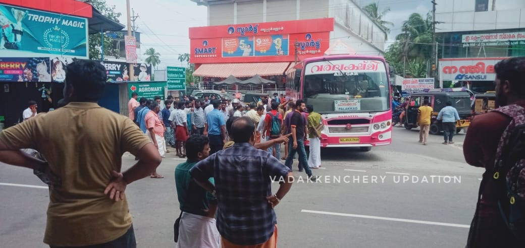 വടക്കഞ്ചേരി തങ്കം തിയ്യറ്ററിന്റെ സമീപത്ത് ബസ് ബൈക്കിൽ ഇടിച്ച് ബൈക്ക് യാത്രക്കാരനായ ബൈജു എന്ന വ്യക്തിയ്ക്ക് ഗുരുതര പരുക്കേറ്റു. വടക്കഞ്ചേരി ഇ.കെ നായനാർ ഹോസ്പിറ്റലേക്ക് കൊണ്ടുപോയ ശേഷം അവിടുന്ന് തൃശ്ശൂർ എലൈറ്റ് ഹോസ്പിറ്റലിലേക്ക് കൊണ്ടുപോയി. വടക്കഞ്ചേരി സ്റ്റാന്റിൽ നിന്നും പാലക്കാട് ഭാഗത്തേക്ക് പോകുന്ന ബസ് തെറ്റായ ദിശയിലാണ് സഞ്ചരിച്ചതെന്നും വർക്ക് ഷോപ്പ് മെക്കാനിക്കായ ബൈജു ഭക്ഷണം കഴിക്കുന്നതിനായി പോയപ്പോൾ ട്രാക്ക് തെറ്റിച്ച് വന്ന ബസ് ബൈജുവിനെ ഇടിക്കുകയായിരുന്നുവെന്നും ഇതിനെതിരെ ശക്തമായ നടപടി എടുക്കണമെന്നും നാട്ടുകാരും ബന്ധുമിത്രാതികളും ആവശ്യപ്പെട്ടു. ബസിലെ ഡ്രൈവർ മാത്രമാണ് വന്നതെന്നും ബസിന്റെ ഉടമ പരിക്ക് പറ്റിയ ആളെ കുറിച്ച് ഇത് വരെ അന്വേഷിച്ചിട്ടില്ലെന്നും പരിക്ക് പറ്റിയ ആളുടെ അനുജനും ബന്ധുമിത്രാതികളും പറഞ്ഞു.