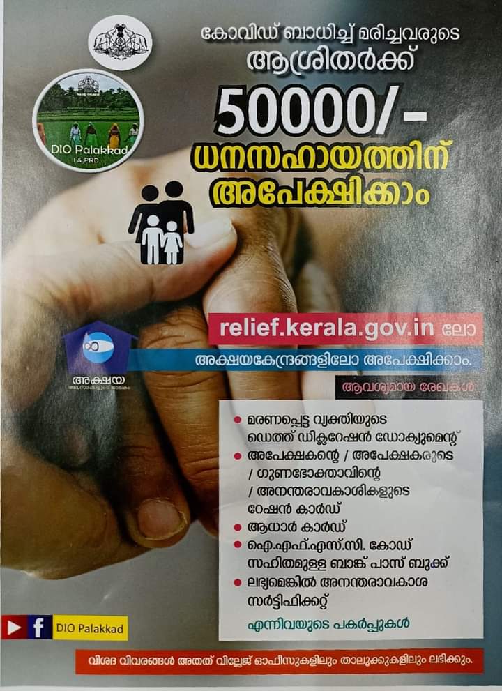 കോവിഡ് ബാധിച്ച് മരണപ്പെട്ട വ്യക്തിയുടെ ആശ്രിതര്ക്ക് 50000 രൂപയുടെ ധനസഹായത്തിന് അപേക്ഷിക്കാം. സംസ്ഥാന ദുരന്ത പ്രതികരണ നിധിയില് നിന്നാണ് ധനസഹായം. കോവിഡ് ബാധിച്ച് മരണപ്പെട്ട ആളുടെ ഭാര്യ/ഭര്ത്താവ്/മാതാപിതാക്കള്/മക്കള്/ആശ്രിതരായ സഹോദരങ്ങള് എന്നിവര്ക്കാണ് ധനസഹായത്തിന് അപേക്ഷിക്കാന് അര്ഹത. relief.kerala.gov.in ല് ഓണ്ലൈനായി അപേക്ഷിക്കാവുന്നതാണ്.