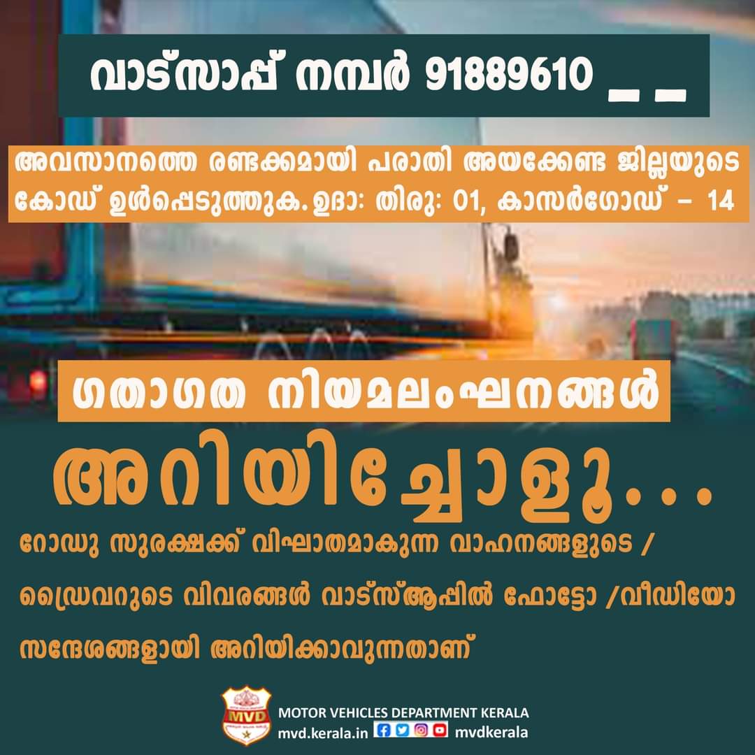 റോഡ് സുരക്ഷക്കക്ക് ഭീഷണിയാകുന്ന രൂപമാറ്റങ്ങൾ വരുത്തുക, സൈലൻസറുകളും ഹോണുകളും മാറ്റി അതി തീവ്ര ശബ്ദം പുറപ്പെടുവിക്കുക, തീവ്ര പ്രകാശം പുറപ്പെടുവിക്കുന്ന ലൈറ്റുകൾ ഘടിപ്പിക്കുക,പൊതു നിരത്തുകളിൽ അഭ്യാസം പ്രകടനം / മൽസരയോട്ടം നടത്തുക, അമിത വേഗതയിലും അപകടകരമായും വാഹനമോടിക്കുക തുടങ്ങിയ സുരക്ഷക്കും സ്വൈര ജീവിതത്തിനും ഭീഷണിയും തടസ്സവും സൃഷ്ടിക്കുന്ന വാഹനങ്ങളെ /ഡ്രൈവർമാരെ പറ്റിയുള്ള വിവരങ്ങൾ ഫോട്ടോകൾ / ചെറിയ വീഡിയോകൾ സഹിതം അതത് ജില്ലകളിലെ എൻഫോഴ്സ്മെൻ്റ് ആർ ടി ഒ മാരെ വാട്സ് അപ്പിൽ അറിയിക്കാവുന്നതാണ്. വിവരങ്ങൾ നൽകുന്നവരുടെ പേരു വിവരങ്ങൾ രഹസ്യമായി സൂക്ഷിക്കുന്നതായിരിക്കുമെന്നും ഉറപ്പ് നൽകുന്നു. ഫോട്ടോ/ വീഡിയോകളോടൊപ്പം സാലം, താലൂക്ക്, ജില്ല എന്നിവ കൂടി ഉൾപ്പെടുത്തണം.