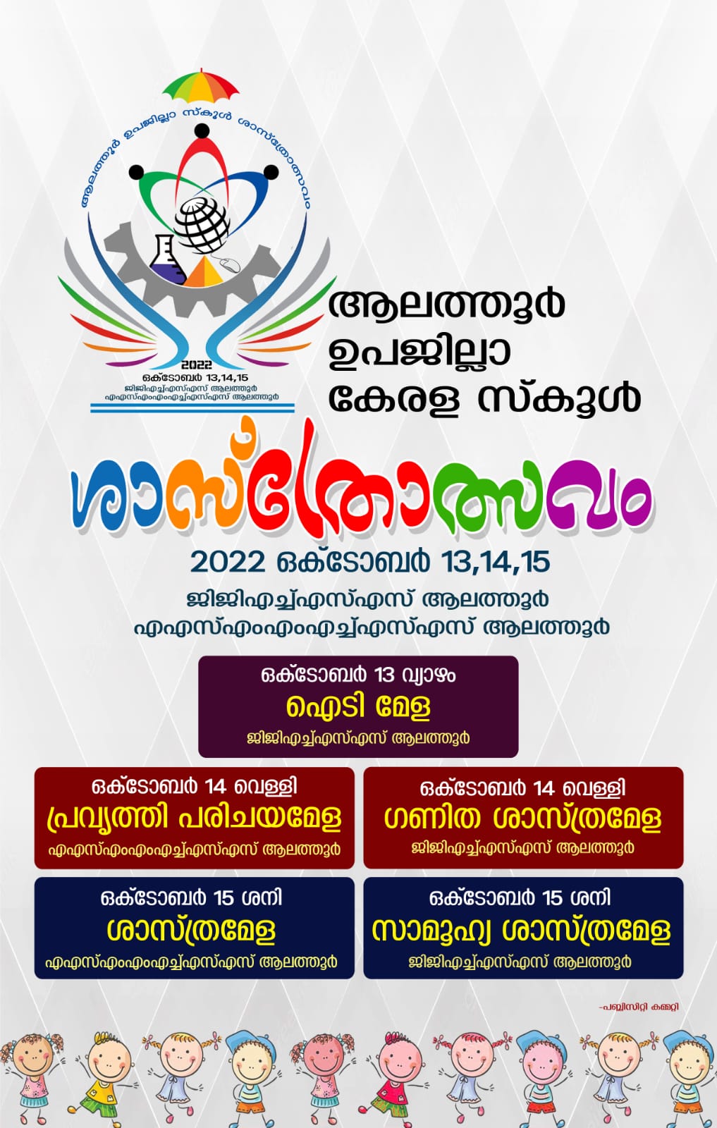 ആലത്തൂർ ഉപജില്ലാ കേരള സ്കൂള് ശാസ്ത്രോത്സവം 2022 ഒക്ടോബര് 13,14,15 വ്യാഴം, വെള്ളി, ശനി തിയ്യതികളിലായി ജിജിഎച്ച്എസ്എസ്, എഎസ്എംഎംഎച്ച്എസ്എസ് ആലത്തൂർ എന്നീ സകൂളുകളിലായി നടക്കും. ഉപജില്ലയിലെ നൂറോളം വിദ്യാലയങ്ങളിൽ നിന്നായി മൂവായിരത്തോളം വിദ്യാർത്ഥികൾ പങ്കെടുക്കും.