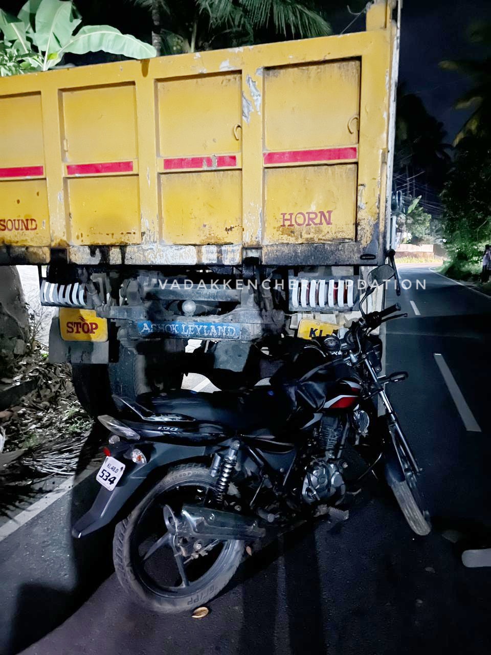 വാണിയംപാറ കല്ലിങ്കൽപ്പാടം േറാഡിലാണ് ടാറിംഗ് പണികൾ ചെയ്ത് കൊണ്ടിരിക്കുമ്പോൾ വേണ്ടത്ര സിഗ്നൽ സംവിധാനങ്ങൾ ഉപയോഗിക്കാതെ പണികൾ നടത്തി കൊണ്ടിരിക്കുമ്പോൾ ലോറിയുടെ പുറകിൽ എളനാട് നിന്നും വന്ന മണി (45) എന്ന ബൈക്ക് യാത്രക്കാരൻ തട്ടി വീണത്. ലോറിയുടെ പുറകിൽ ലൈറ്റുകൾ ഇടാതെയാണ് റോഡ് സൈഡിൽ പാർക്ക് ചെയ്തത് എന്ന് നാട്ടുകാർ പറഞ്ഞു. ബൈക്ക് യാത്രക്കാരന് ചെവിയുടെ ഭാഗത്ത് പരിക്കുണ്ട്. അപകടം നടന്ന ഉടൻ തന്നെ 108 ആംബുലൻസിൽ തൃശൂർ ആശൂപത്രിയിലേക്ക് കൊണ്ടുപോയി