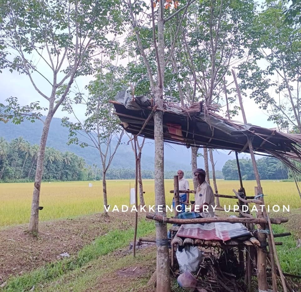 വടക്കഞ്ചേരി : നെല്ല് കാട്ടുപന്നിനാശം വരുത്തുന്നത് രൂക്ഷമായതോടെ വിളഞ്ഞു തയ്യാറായ നെൽപ്പാടത്തിന് സമീപം ഷെഡ് കെട്ടി കാവൽ ഇരിക്കുകയാണ് കർഷകർ. ഒന്നാം വിള കൊയ്യാൻ ദിവസങ്ങൾ മാത്രം ശേഷിച്ചിരിക്കയാണെങ്കിലും ഒരു മാസത്തോളമായി കാവൽ കിടന്ന് സംരക്ഷിക്കാൻ തുടങ്ങിയിട്ട്.രാത്രികാലങ്ങളിൽ കൂട്ടത്തോടെ എത്തി വിള നശിപ്പിക്കുന്ന പന്നിക്കൂട്ടത്തിന്റെ ആക്രമണത്തിൽ നിന്ന് സംരക്ഷിക്കുവാൻ ഒരു മാസത്തിലേറെയായി കർഷകർ കാവൽ ആരംഭിച്ചിട്ട്.
