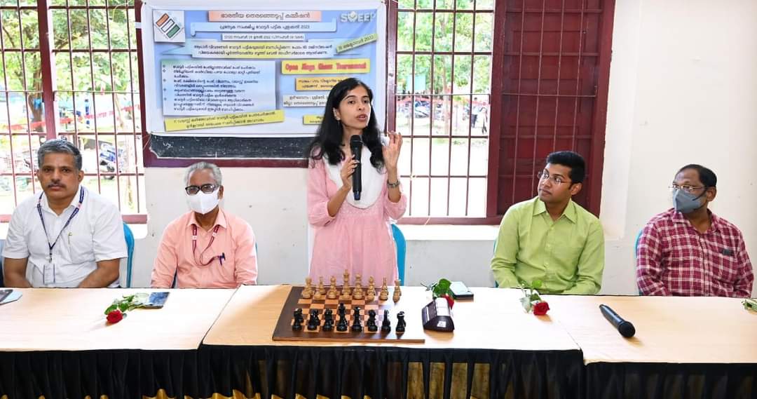 ആധാര് വിവരങ്ങള് വോട്ടര് പട്ടികയുമായി ബന്ധിപ്പിക്കുന്ന ഫോറം. 6 ബി രജിസ്ട്രേഷന്റെയും 17 വയസ് പൂര്ത്തിയായവര്ക്ക് വോട്ടര് പട്ടികയില് പേര് ചേര്ക്കുന്നതിന് മുന്കൂറായി അപേക്ഷ നല്കുന്നതിന്റെയും പ്രചാരണത്തോടനുബന്ധിച്ച് ജില്ലയിലെ സ്വീപ് പ്രവര്ത്തനങ്ങളുടെ ഭാഗമായി ജില്ല തെരഞ്ഞെടുപ്പ് വിഭാഗത്തിന്റെ നേതൃത്വത്തിൽ മെഗാ ചെസ് ടൂര്ണമെന്റ് സംഘടിപ്പിച്ചു. ഗവ. വിക്ടോറിയ കോളെജില് ജില്ലാ കലക്ടര് മൃണ്മയി ജോഷി ടൂർണമെന്റ് ഉദ്ഘാടനം ചെയ്തു.