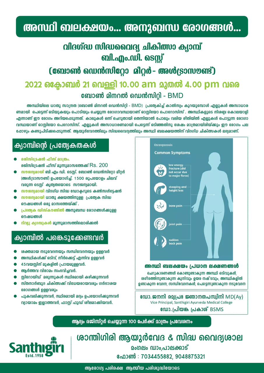 വിദഗ്ദ്ധ സിദ്ധവൈദ്യ ചികിത്സാ ക്യാമ്പ് ബി.എം.ഡി. ടെസ്റ്റ് (ബോൺ ഡെൻസിറ്റോ മീറ്റർ – അൾട്രാസൗണ്ട്).
