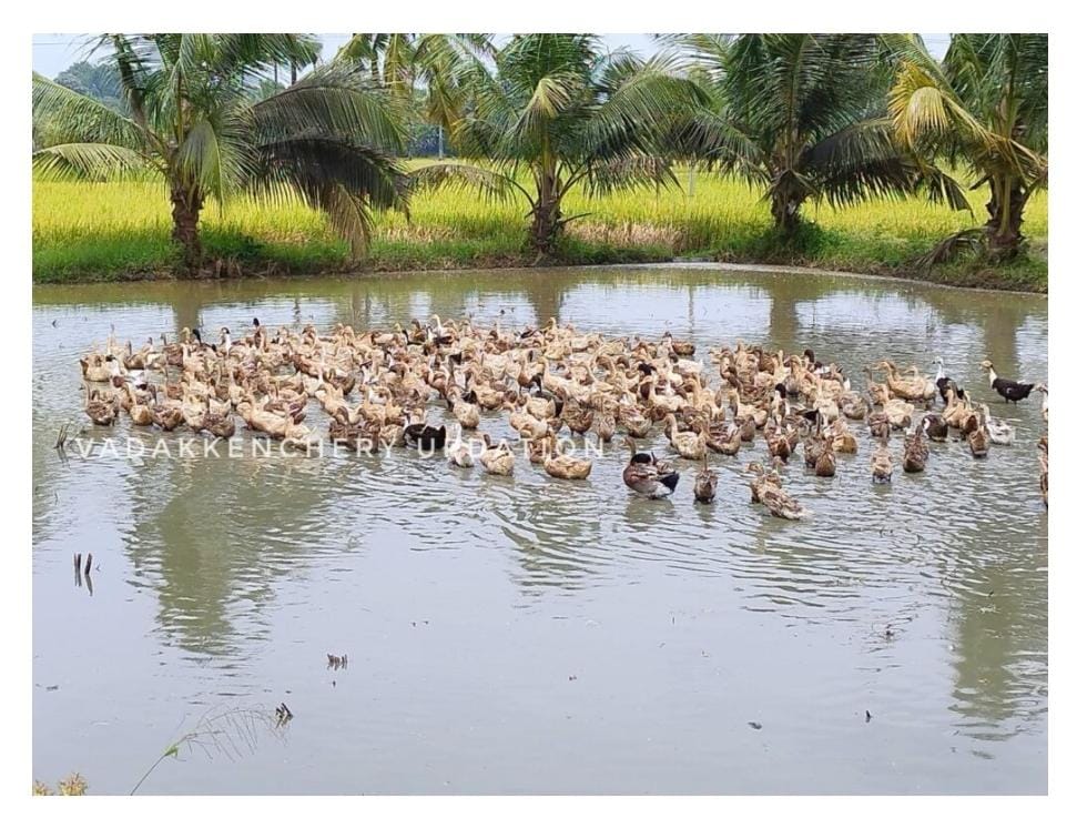 ന്നാം വിള കൊയ്തൊഴിഞ്ഞ നെൽപ്പാടങ്ങളിൽ താറാവിൽ കൂട്ടങ്ങളെത്തി. തമിഴ്നാട്ടിലെ ധാരാപുരം, ദിണ്ടുകൽ ഭാഗങ്ങളിൽ നിന്നുള്ള തമിഴ് താറാവ് കർഷകരാണ് കുടുംബസമേതം താറാവിൻ പറ്റങ്ങളുമായി വടക്കഞ്ചേരി ആലത്തൂർ . കിഴക്കഞ്ചേരി നെന്മാറ, അയിലൂർ പ്രദേശങ്ങളിലെ വെള്ളമുള്ള നെൽപ്പാടങ്ങളിൽ താറാവുകളെ തീറ്റിക്കാനായി എത്തിയിട്ടുള്ളത്. കുടുംബസമേതം നെൽപ്പാടങ്ങളുടെ വരമ്പുകളിൽ തന്നെ ആഹാരം പാകം ചെയ്ത് ഭക്ഷണം കഴിക്കുകയാണ് ഇവർ ചെയ്യാറുള്ളത്. ലഭിക്കുന്ന മുട്ടകൾ പ്രാദേശിക വിപണിയിലും ഏജന്റ്മാർ ആഴ്ചയിൽ ഒരു ദിവസം നിശ്ചിത സ്ഥലത്ത് വാഹനവുമായി വന്ന് മുട്ട ശേഖരിക്കുകയും ചെയ്യുന്നുണ്ട്. രണ്ടാം വിള നടൽ ആരംഭിക്കുന്നതു വരെ വെള്ളമുള്ള വിവിധ പാട ശേഖരങ്ങളിൽ ഇവരുടെ സാന്നിധ്യം സജീവമായുണ്ട്. താറാവുകളെ തീറ്റാൻ അനുവദിക്കുന്നതിന് നിശ്ചിത അളവിലുള്ള നെൽപ്പാടത്തിന് നിശ്ചിത എണ്ണം മുട്ടകളാണ് പ്രതിഫലമായി കർഷർക്ക് നൽകുന്നത്. എല്ലാവർഷവും തുടർച്ചയായി സീസണുകളിൽ ലോറികളിൽ കൊണ്ടുവരുന്ന താറാവ് കൂട്ടങ്ങളെ നിശ്ചിത സ്ഥലങ്ങളിൽ ഇറക്കുകയും രണ്ടുമൂന്നു ആഴ്ചകൾ കഴിയുമ്പോൾ പുതിയ സ്ഥലങ്ങളിലേക്ക് താറാവിൻ കൂട്ടങ്ങളെ കയറ്റിക്കൊണ്ടുപോകുന്നതിന് സ്ഥിരമായി പ്രത്യേക സംവിധാനത്തിൽ തട്ടുകളോടെ കൂടുകൾ ഒരുക്കിയ വാഹനങ്ങളും വരാറുണ്ട്.