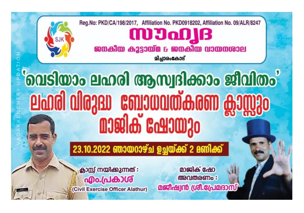 മിച്ചാരംകോട് സൗഹൃദ ജനകീയ കൂട്ടായ്മയും ജനകീയ വായനശാലയും സംയുക്തമായി സംഘടിപ്പിക്കുന്ന ലഹരി വിരുദ്ധ ബോധവൽകരണ ക്ലാസ്സും മാജിക്ഷോയും (23-10-2022 ) ഞായറാഴ്ച ഉച്ചയ്ക്ക് 2 ന് സൗഹ്യദ അക്കാദമി ഹാളിൽ വെച്ച് നടത്തുന്നു. ആലത്തൂർ സിവിൽ എക്സൈസ് ഓഫീസർ എം പ്രകാശ് ക്ലാസ്സ് നയിക്കുന്നത്. പ്രസിദ്ധ മജീഷ്യൻ പ്രേമദാസ് മാജിക്ക് ഷോ അവതരിപ്പിക്കുന്നു.