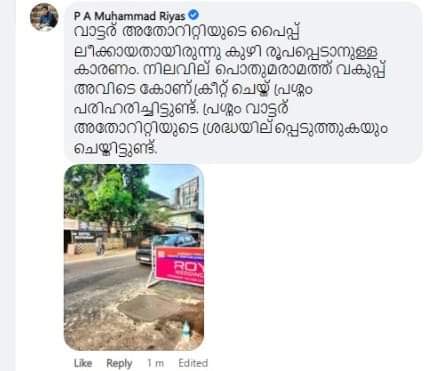 പിറ്റേന്ന് ഉച്ചയ്ക്ക് ശേഷം അവിടെ കുഴി അടയ്ക്കുന്ന പ്രവൃത്തി ആരംഭിച്ചിരുന്നു. പ്രവൃത്തി പൂര്ത്തിയായ ശേഷം അതിന്റെ ഫോട്ടോ സഹിതം കബീറിന് മന്ത്രി മറുപടി നല്കി. വാട്ടര് അതോറിറ്റിയുടെ പൈപ്പ് ലീക്കായതുമായി ബന്ധപ്പെട്ടാണ് കുഴി രൂപപ്പെട്ടത്. പരാതി ശ്രദ്ധയില്പ്പെട്ട മന്ത്രി അത് ഉദ്യോഗസ്ഥര്ക്ക് കൈമാറുകയും പൊതുമരാമത്ത് വകുപ്പിന്റെ നേതൃത്വത്തില് അവിടെ കോണ്ക്രീറ്റ് പ്രവൃത്തി നടത്തുകയുമായിരുന്നു.പൈപ്പിന്റെ ലീക്കേജ് പൂര്ണമായി മാറ്റിയതിന് ശേഷം റോഡിലെ കുഴി നികത്തേണ്ടത് വാട്ടര് അതോറ്റിയാണ്. ഇനിയും പൈപ്പ് ലീക്കേജ് ഉണ്ടായാല് കുഴി പഴയത്പോലെ ആയേക്കാം. ഇക്കാര്യം പൊതുമരാമത്ത് ഉദ്യോഗസ്ഥര് വാട്ടര് അതോറ്റിയെ അറിയിച്ചിട്ടുണ്ട് എന്നാണ് ഉദ്യോഗസ്ഥര് അറിയിച്ചിട്ടുള്ളത്.