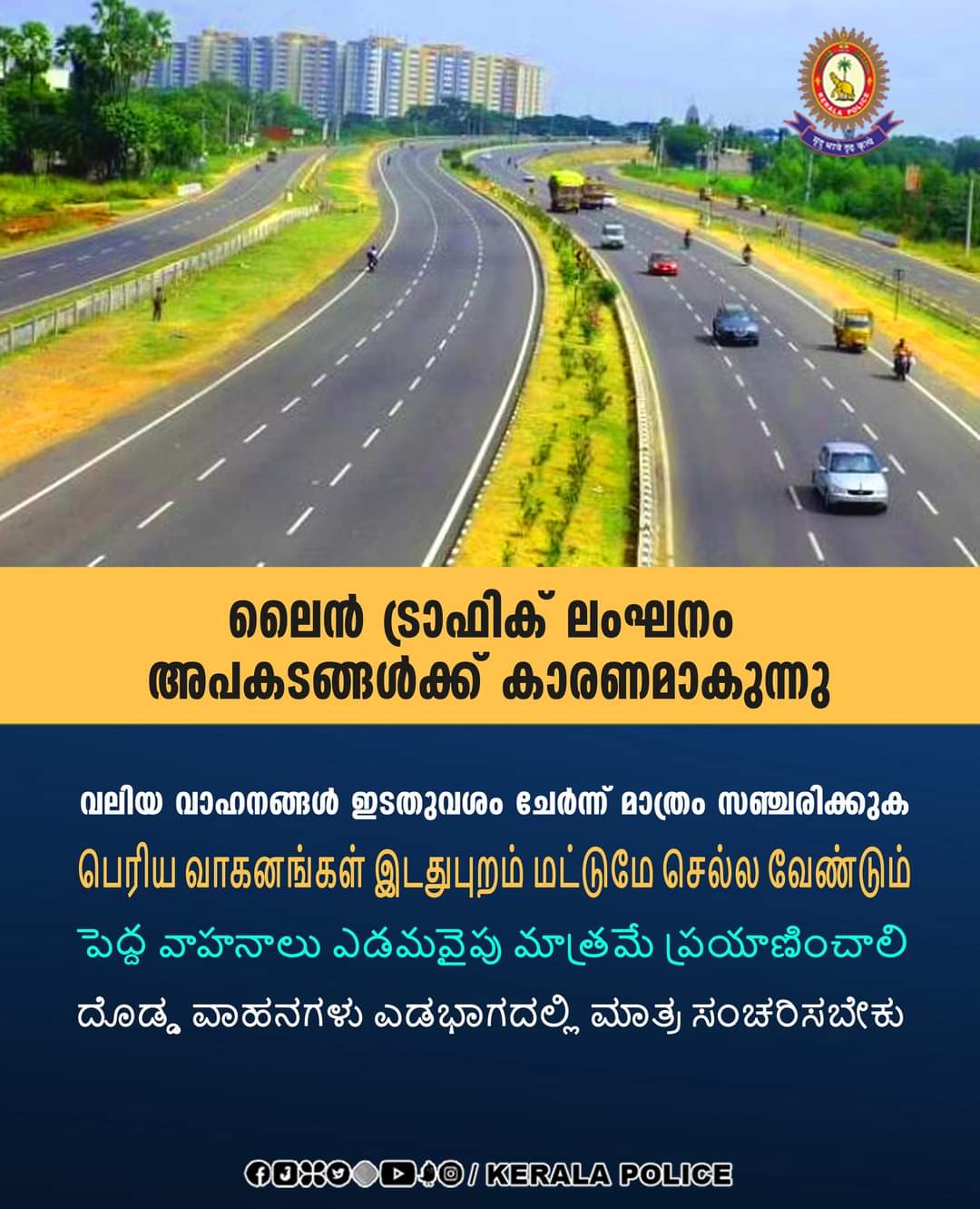 ലൈൻ ട്രാഫിക് നിർദ്ദേശിച്ചിരിക്കുന്ന നാലുവരി / ആറുവരി പാതകളിൽ വലിയ വാഹനങ്ങൾ, ഭാരം കയറ്റിയ വാഹനങ്ങൾ, വേഗത കുറഞ്ഞ വാഹനങ്ങൾ എന്നിവ ഇടതുവശം ചേർന്ന് മാത്രമേ പോകാവൂ. വലതുവശത്തെ ലൈനിലൂടെ ഇത്തരം വാഹനങ്ങൾ സഞ്ചരിക്കുന്നത് പിന്നിലുള്ളവർക്ക് ഏറെ ബുദ്ധിമുട്ടുണ്ടാക്കുകയും അവർക്ക് ഓവർടേക്ക് ചെയ്തു പോകാൻ കഴിയാതെ വരുകയും ചെയ്യുന്നു. മാത്രമല്ല, ഇതുമൂലം ഇടതുവശത്തുകൂടെ ഓവർടേക്ക് ചെയ്യാനുള്ള പ്രവണത കാണപ്പെടുകയും ആയത് അപകടങ്ങൾക്ക് കാരണമാകുകയും ചെയ്യുന്നു.