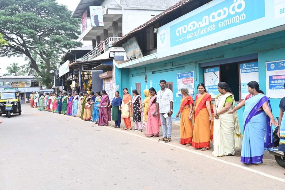 ഒറ്റപ്പാലം ബ്ലോക്ക് പഞ്ചായത്ത് പ്രസിഡന്റ് ശോഭന രാജേന്ദ്രപ്രസാദ്, ഗ്രാമപഞ്ചായത്ത് പ്രസിഡന്റ് ഇ. ചന്ദ്രബാബു, ബ്ലോക്ക് പഞ്ചായത്ത് മെമ്പര് എ. പ്രഭാവതി, ആരോഗ്യ-വിദ്യാഭ്യാസ സ്റ്റാന്ഡിങ് കമ്മിറ്റി ചെയര്മാന് പി.കെ അനില്കുമാര് എന്നിവര് ചളവറ ഗാന്ധി ചത്വരത്തിന് സമീപം അവസാന കണ്ണികളായി. കയിലിയാട് സെന്ററില് ഒറ്റപ്പാലം ബ്ലോക്ക് പഞ്ചായത്ത് മെമ്പര് എന്. മനോജ്, ക്ഷേമകാര്യ സ്ഥിരം സമിതി അധ്യക്ഷ പി. സുനന്ദ, ഗ്രാമപഞ്ചായത്ത് അംഗം പി. വിശ്വനാഥന്, ആസൂത്രണ സമിതി ഉപാധ്യക്ഷന് കെ. ഗോപാലകൃഷ്ണന് എന്നിവര് പങ്കെടുത്തു. ജനപ്രതിനിധികള്, രാഷ്ട്രീയ, സാമൂഹ്യ, സാംസ്കാരിക, സന്നദ്ധ പ്രവര്ത്തകര്, കുടുബശ്രീ പ്രവര്ത്തകര്, ഗ്രന്ഥശാല പ്രവര്ത്തകര്, വിദ്യാര്ത്ഥികള്, യൂത്ത് ക്ലബ്ബ് പ്രവര്ത്തകര് തുടങ്ങിയവര് അണിനിരന്നു.