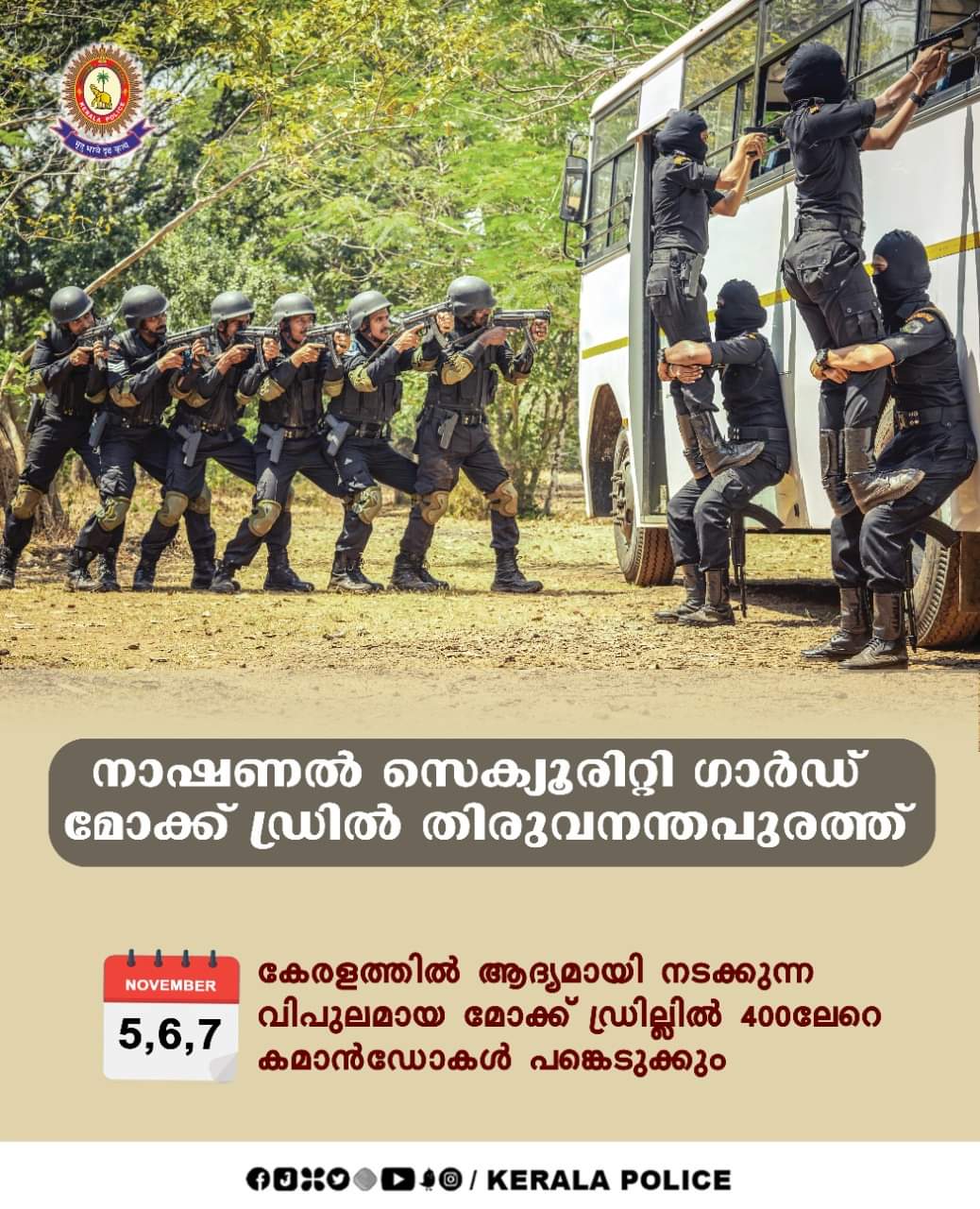 അടിയന്തിരഘട്ടങ്ങൾ നേരിടുന്നതിനുള്ള ഒരുക്കങ്ങൾ വർദ്ധിപ്പിക്കുന്നതിനും വിവിധ ഏജൻസികൾ തമ്മിൽ ഏകോപനം ഉറപ്പാക്കുന്നതിനുമായി നവംബർ അഞ്ച്, ആറ്, ഏഴ് തീയതികളിൽ നാഷണൽ സെക്യൂരിറ്റി ഗാർഡ് തിരുവനന്തപുരത്ത് മോക്ക് ഡ്രിൽ സംഘടിപ്പിക്കും. ഇത്രയും വിപുലമായ മോക്ക് ഡ്രിൽ കേരളത്തിൽ നടക്കുന്നത് ആദ്യമായാണ്.