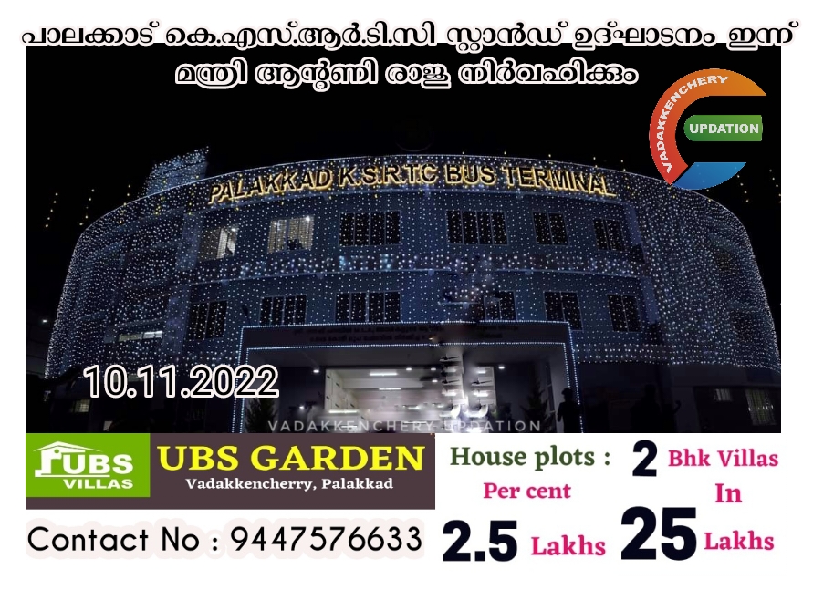 പാലക്കാട് കെ.എസ്.ആര്.ടി.സി സ്റ്റാന്ഡ് ഉദ്ഘാടനം ഇന്ന് വൈകിട്ട് 5.30 ന് ഗതാഗത വകുപ്പ് മന്ത്രി ആന്റണി രാജു നിര്വഹിക്കും. പരിപാടിയില് കൊമേഴ്സ്യല് സ്പേസിന്റെ ഉദ്ഘാടനം തദ്ദേശസ്വയംഭരണ-എക്സൈസ് വകുപ്പ് മന്ത്രി എം.ബി രാജേഷ് നിര്വഹിക്കും. ഓഫീസ് ഉദ്ഘാടനം വൈദ്യുതി വകുപ്പ് മന്ത്രി കെ. കൃഷ്ണന്കുട്ടിയും ഷീ സ്പേസ് ഉദ്ഘാടനം പ്രതിപക്ഷ നേതാവ് വി.ഡി സതീശനും നിര്വഹിക്കും. സ്റ്റേഷന് മാസ്റ്റര് ഓഫീസ്, റിസര്വേഷന് കൗണ്ടര് എന്നിവയുടെ ഉദ്ഘാടനം വി.കെ ശ്രീകണ്ഠന് എം.പി നിര്വഹിക്കും.