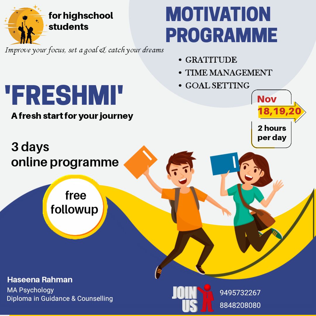 ഹൈസ്കൂളിൽ പഠിക്കുന്ന കുട്ടിയുടെ രക്ഷിതാവാണോ നിങ്ങൾ..?എങ്കിൽ നിങ്ങൾ നിങ്ങളുടെ കുട്ടിയ്ക്ക് നൽകുന്ന ഏറ്റവും വലിയ സമ്മാനമായിരിക്കും ഈ ക്ലാസ്സ്. പഠന മികവിനായി സമയം നന്നായി ഉപയോഗിക്കാനും, ലക്ഷ്യബോധം ഉണ്ടാക്കുവാനും ഈ ക്ലാസ്സ് സഹായിക്കും. മൂന്നുദിവസത്തെ ഈ online class തീർച്ചയായും അവരിൽ നല്ല മാറ്റങ്ങൾ ഉണ്ടാക്കും . സ്വന്തം മകന്റെ / മകളുടെ ഉയർന്ന വിജയം ആഗ്രഹിക്കുന്നുവെങ്കിൽ ഈ നമ്പറിൽ contact ചെയ്യാവുന്നതാണ്.