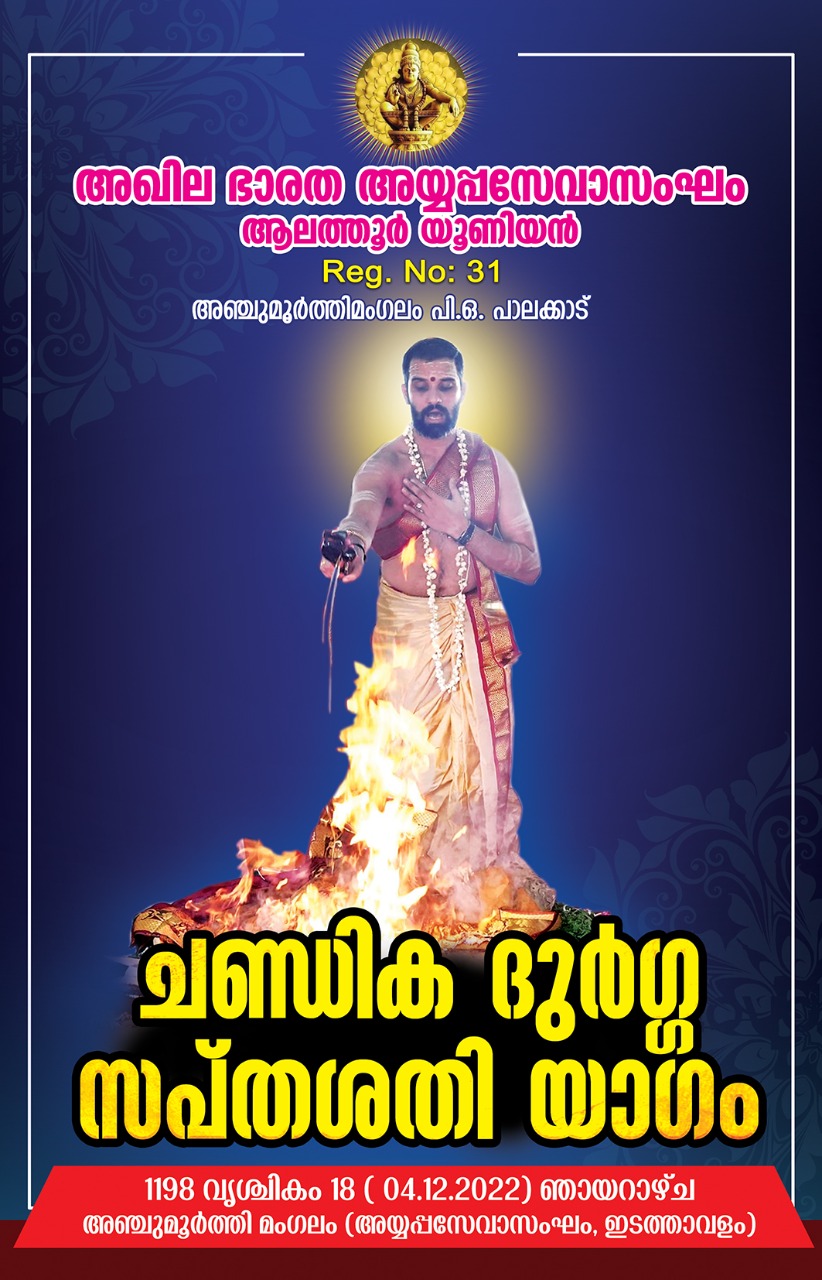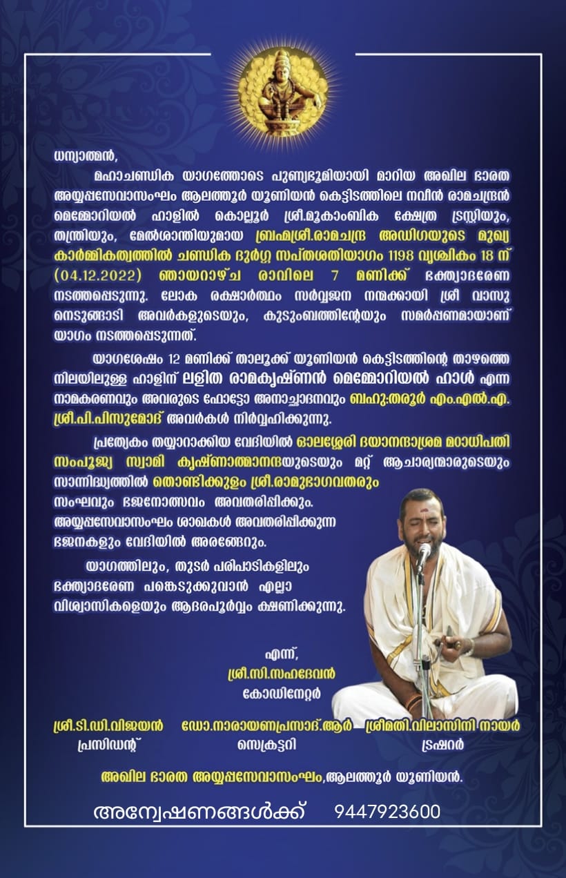 മഹാചണ്ഡിക യാഗത്തോടെ പുണ്യഭൂമിയായി മാറിയ അഖില ഭാരത അയ്യപ്പസേവാസംഘം ആലത്തൂർ യൂണിയൻ കെട്ടിടത്തിലെ നവീൻ രാമചന്ദ്രൻ മെമ്മോറിയൽ ഹാളിൽ കൊല്ലൂർ ശ്രീ.മൂകാംബിക ക്ഷേത്ര ട്രസ്റ്റിയും, തന്ത്രിയും, മേൽശാന്തിയുമായ ബ്രഹ്മശ്രീ.രാമചന്ദ്ര അഡിഗയുടെ മുഖ്യ കാർമ്മികത്വത്തിൽ ചണ്ഡിക ദുർഗ്ഗ സപ്തശതിയാഗം (04.12.2022) നാളെ ഞായറാഴ്ച രാവിലെ 7 മണിക്ക് നടത്തുന്നു. ലോക രക്ഷാർത്ഥം സർവ്വജന നന്മക്കായി വാസു നെടുങ്ങാടി കുടുംബത്തിന്റേയും സമർപ്പണമായാണ് യാഗം നടത്തപ്പെടുന്നത്.യാഗശേഷം 12 മണിക്ക് താലൂക്ക് യൂണിയൻ കെട്ടിടത്തിന്റെ താഴത്തെ നിലയിലുള്ള ഹാളിന് ലളിത രാമകൃഷ്ണൻ മെമ്മോറിയൽ ഹാൾ എന്ന നാമകരണവും അവരുടെ ഫോട്ടോ അനാച്ഛാദനവും തരൂർ എം.എൽ.എ. പി.പി സുമോദ് നിർവ്വഹിക്കും