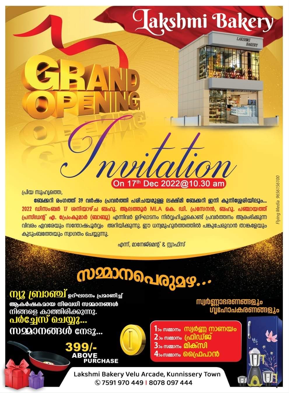 ബേക്കറി രംഗത്ത് 39 വർഷം പ്രവർത്തി പരിചയമുള്ള ലക്ഷ്മി ബേക്കറി ഇനി കുനിശ്ശേരിയിലും… 2022 ഡിസംബർ 17 ശനിയാഴ്ച ആലത്തൂർ MLA കെ. ഡി. പ്രസേനൻ, പഞ്ചായത്ത് പ്രസിഡന്റ് എ. പ്രേംകുമാർ (ബാബു) എന്നിവർ ഉദ്ഘാടനം നിർവ്വഹിച്ചുകൊണ്ട് പ്രവർത്തനം ആരംഭിക്കുന്ന വിവരം ഏവരേയും സന്തോഷപൂർവ്വം അറിയിക്കുന്നു. ഈ ധന്യമുഹൂർത്തത്തിൽ പങ്കുചേരുവാൻ താങ്കളേയും കുടുംബത്തേയും സ്വാഗതം ചെയ്യുന്നു.